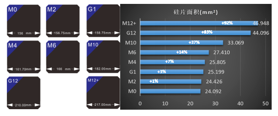 當(dāng)前組件技術(shù)不斷的更新迭代,如高效PERC,黑硅、雙玻、半片、疊瓦等;硅片方面,硅片的尺寸也不斷的增大,從156發(fā)展到182、210,硅片面積分別增加了37%和83%。