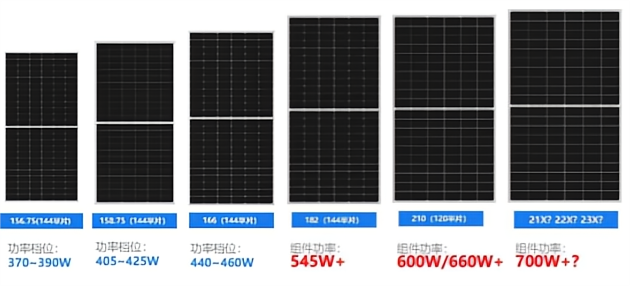 與之對(duì)應(yīng)的182組件功率超過(guò)540W, 210組件功率超過(guò)600W,并且,有部分廠家結(jié)合其它新技術(shù)使組件功率達(dá)700W+。
