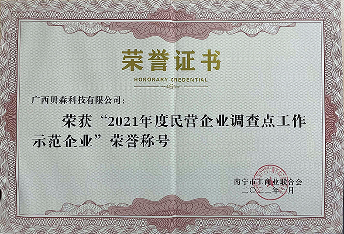 廣西貝森科技有限公司榮獲南寧市工商業(yè)聯合會授予的“2021年度民營企業(yè)調查點工作示范企業(yè)”榮譽稱號