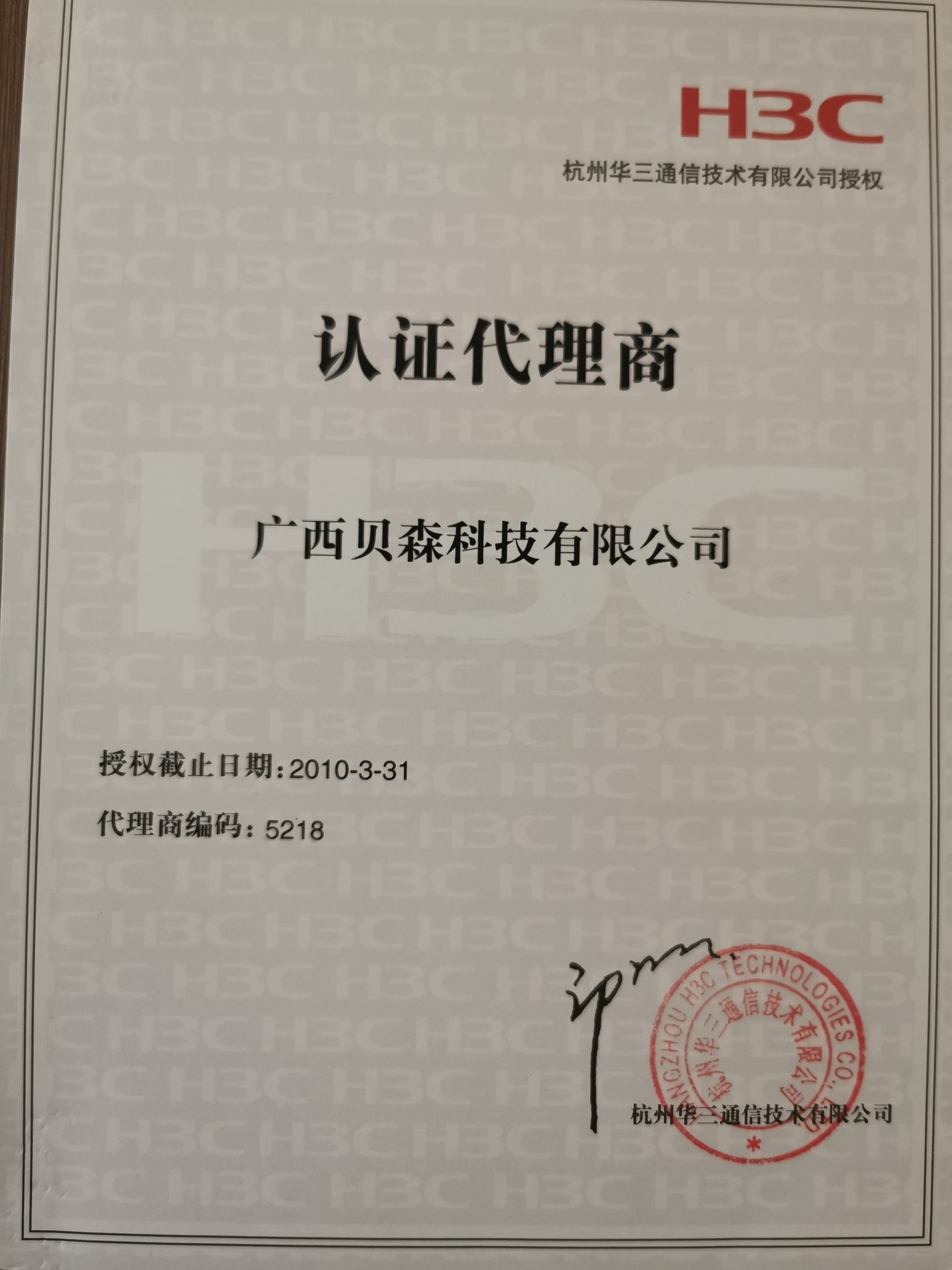 廣西貝森科技有限公司獲得華三渠道認(rèn)證授權(quán)書
