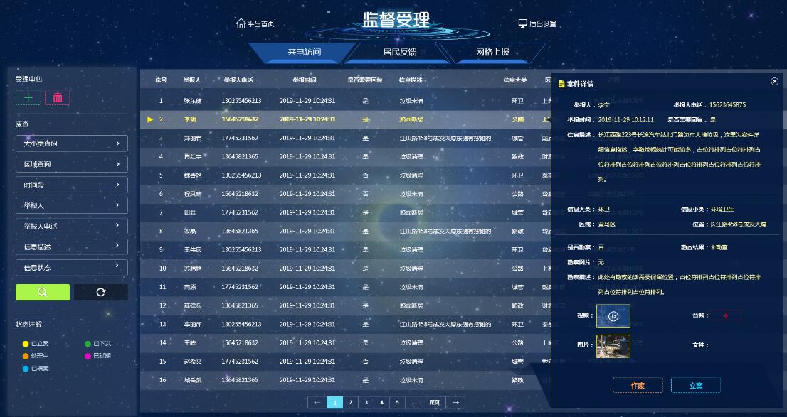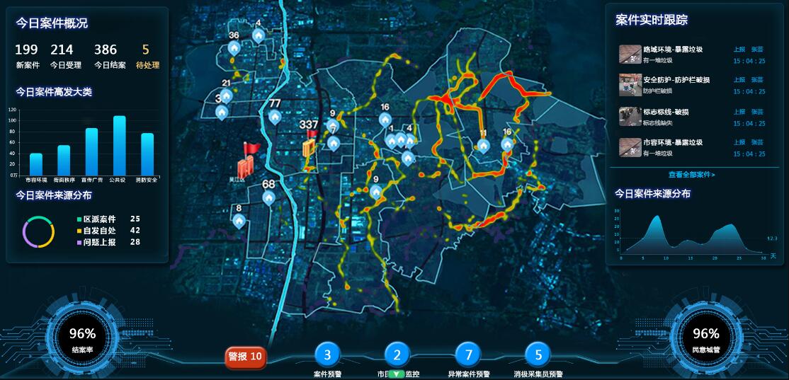 案卷滾動信息區(qū)能夠實時統(tǒng)計反映全市、區(qū)(縣)所有網(wǎng)格在辦案卷數(shù);滾動顯示正在辦理的每個案卷基本信息;詳細信息區(qū)是指到單個問題、網(wǎng)格的詳細信息,包括城管信息員位置、案卷辦理情況、綜合評價結果等。