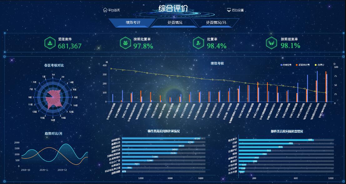 建立數(shù)字化城市管理綜合評價子系統(tǒng),通過一整套科學完善的監(jiān)督評價體系,對城市管理的各方面進行考核評價,既能監(jiān)督城市管理中發(fā)生的具體問題,又能監(jiān)督管理和執(zhí)法質量。該子系統(tǒng)通過各類報表、統(tǒng)計圖表的方式直觀的顯示考核結果,同時根據(jù)考核公示生成評價結果。該子系統(tǒng)主要進行三大類型的評價功能: